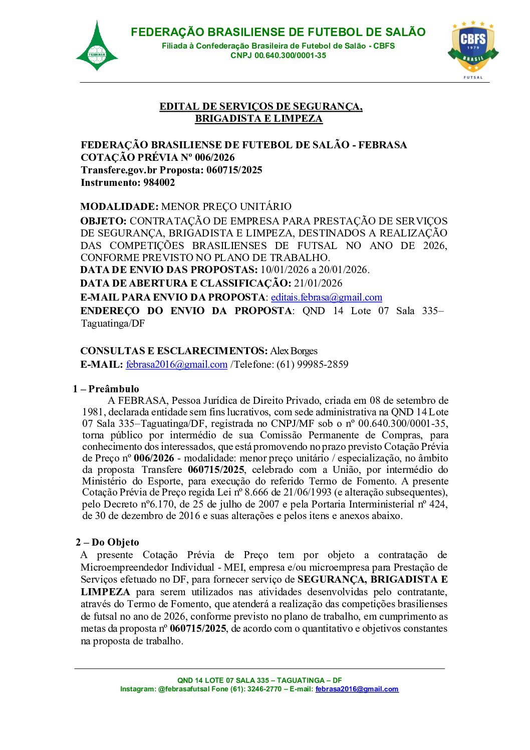 EDITAL SERVIÇOS DE SEGURANÇA, BRIGADISTA E LIMPEZA.